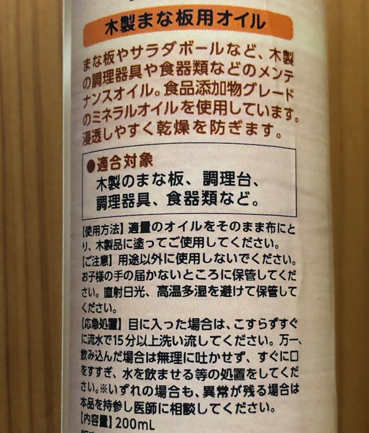 食品添加物グレードのミネラルオイルです。無味・無臭なので料理店のまな板でも採用されているタイプです。